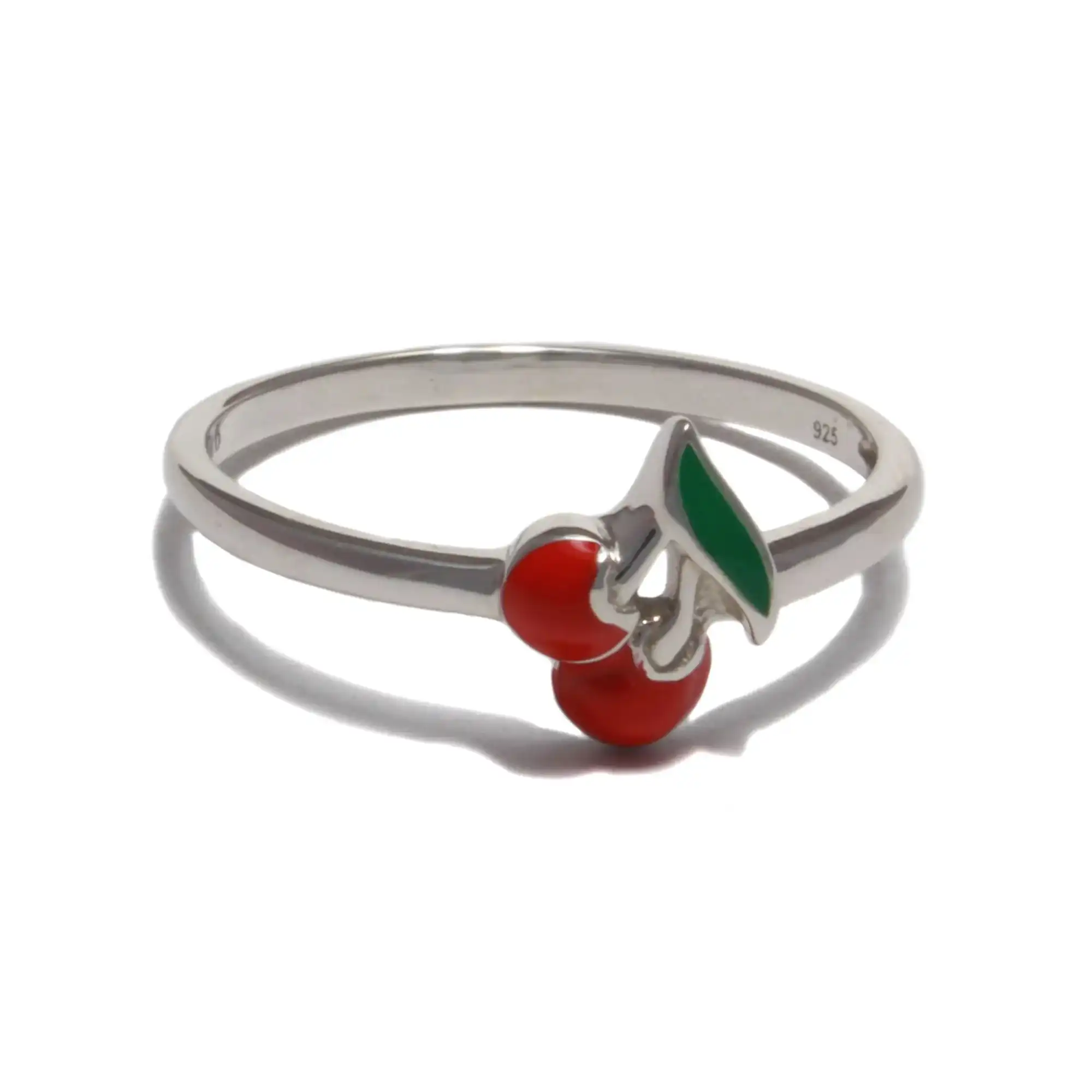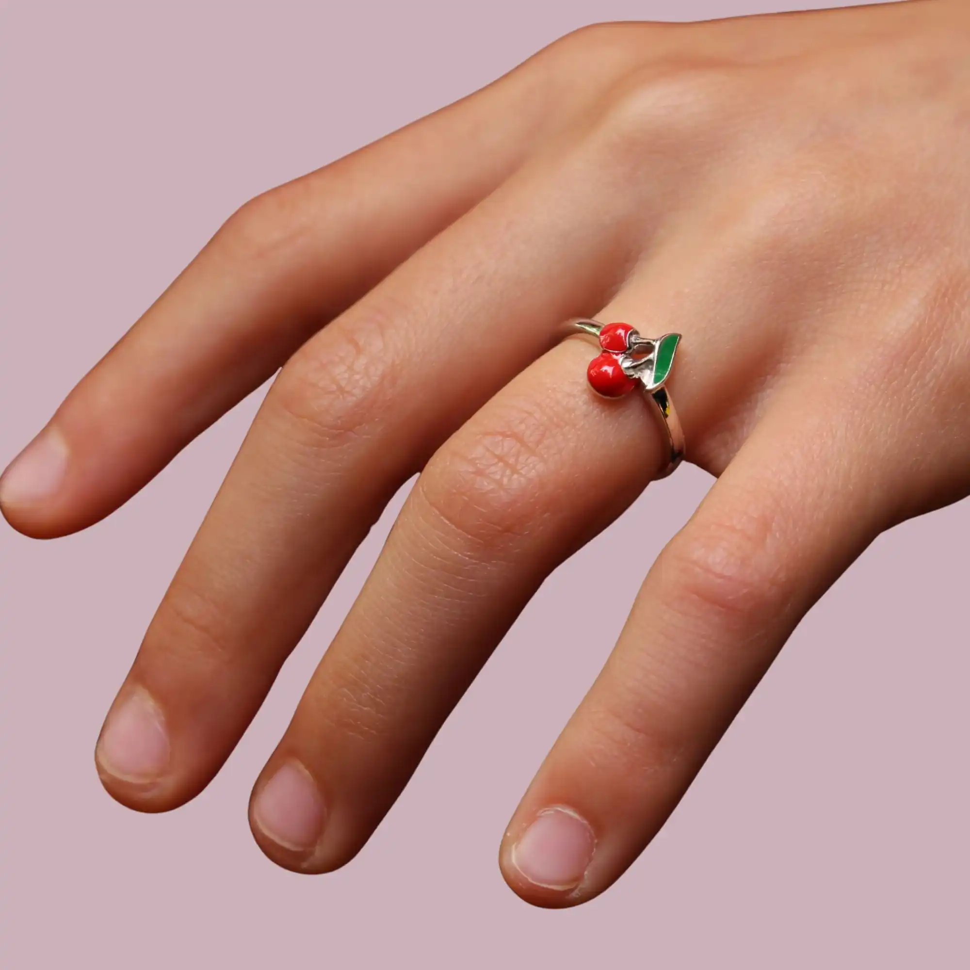 Dieser rote Kirschen Ring aus echtem 925 Sterling Silber ist ein echtes Highlight für alle, die verspielten Schmuck lieben. Zwei glänzende rote Emaille-Kirschen hängen an feinen silbernen Stielen – detailreich gearbeitet und von Hand emailliert. Das rhodinierte Silber sorgt dafür, dass der Ring dauerhaft strahlend bleibt und nicht anläuft. Er ist in Kindergrößen und in Erwachsenengrößen erhältlich, perfekt also für alle Generationen von Kirschfans.