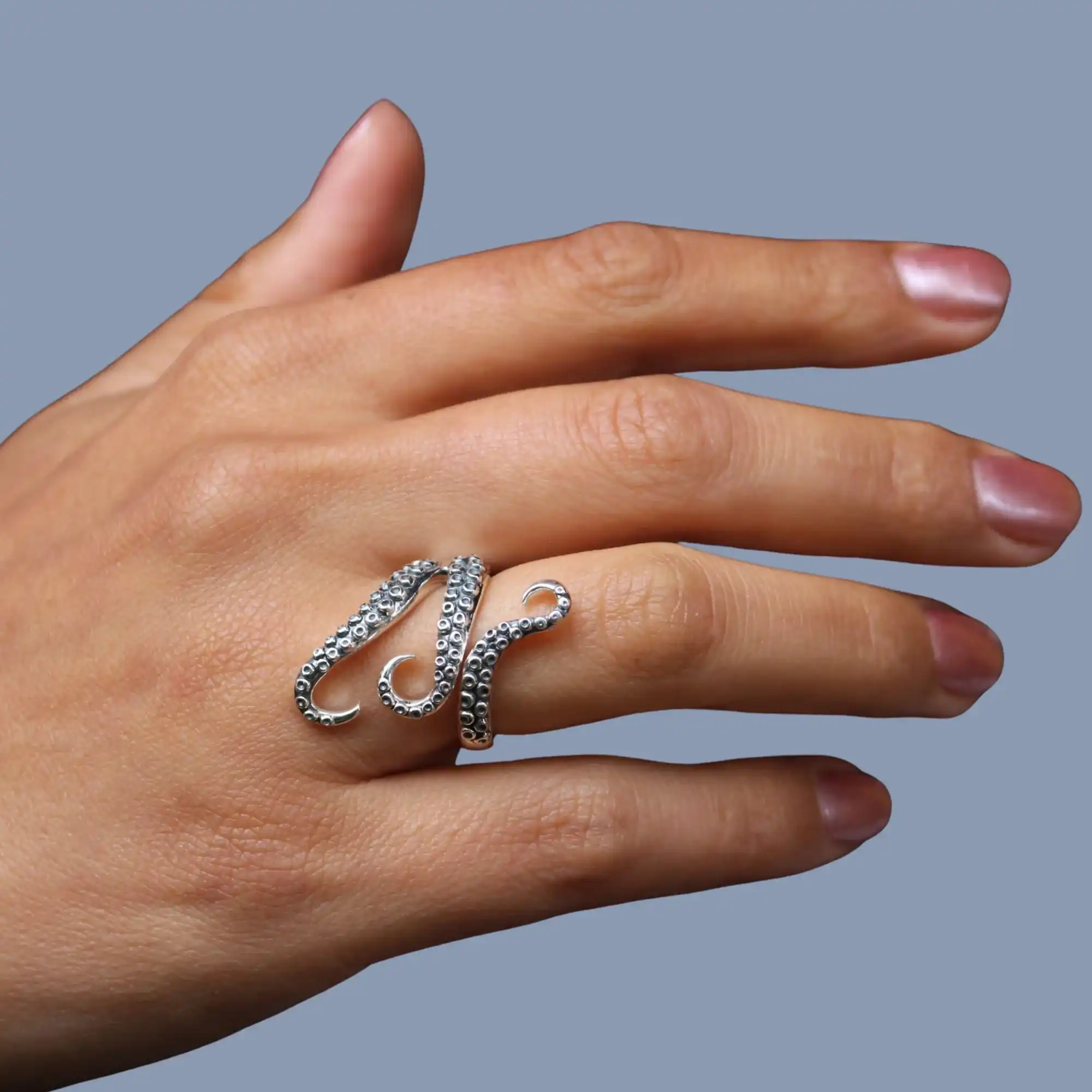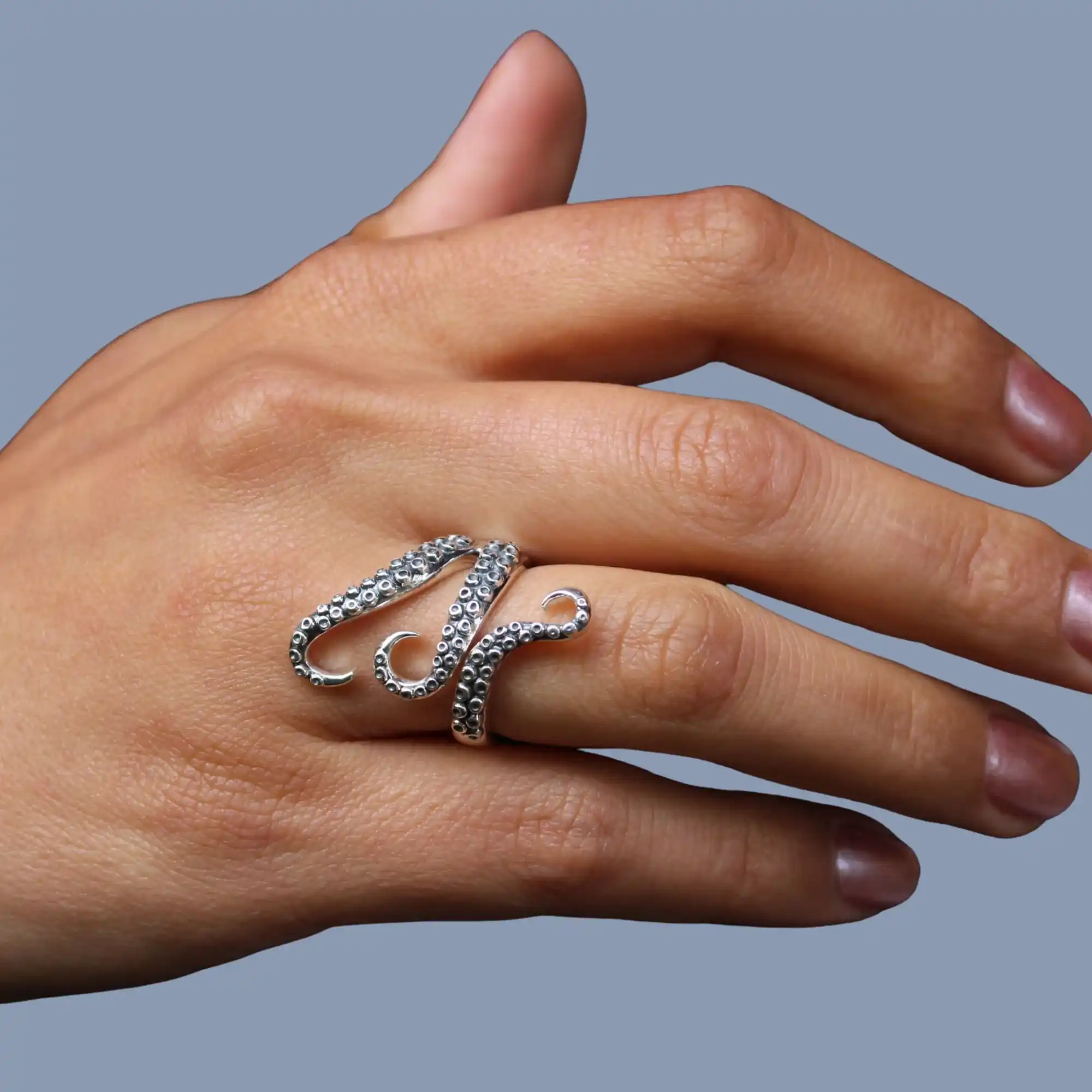 Dieser Ring aus hochwertigem 925 Sterling Silber, oxidiert, präsentiert ein lebensechtes Tentakel-Design eines Kraken, das sich kraftvoll um deinen Finger wickelt. Jeder Saugnapf der Tentakel ist fein gestaltet und sorgt für eine beeindruckende 3D-Optik. Der offene Ringaufsatz erlaubt einen leicht variablen Sitz – ideal für wechselnde Finger oder zur kleinen Anpassung.