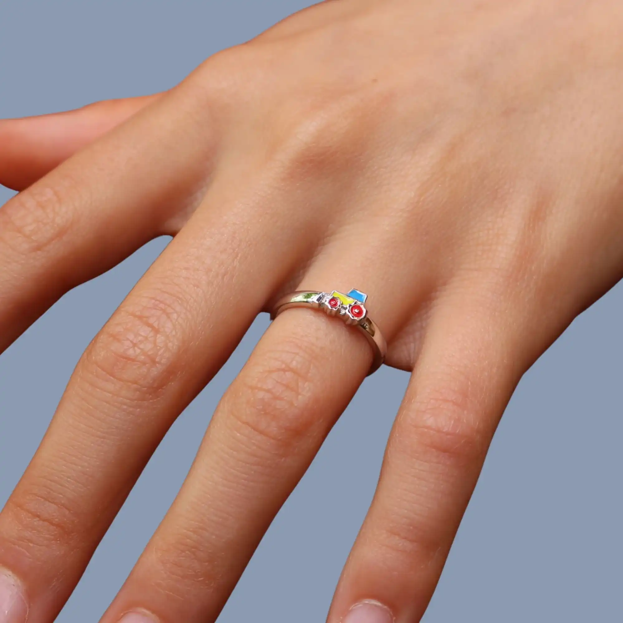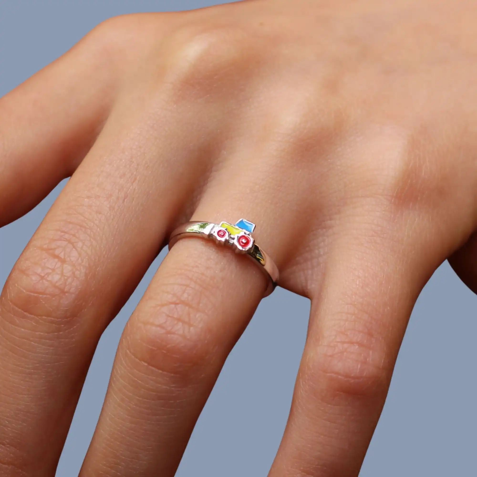 Dieser liebevoll gestaltete Kinder Ring zeigt einen farbenfrohen Bagger mit vielen Details. Das Motiv ist handemailliert und wirkt dadurch besonders lebendig und hochwertig. Durch die fröhlichen Farben wird der Ring schnell zum Lieblingsschmuckstück im Alltag.