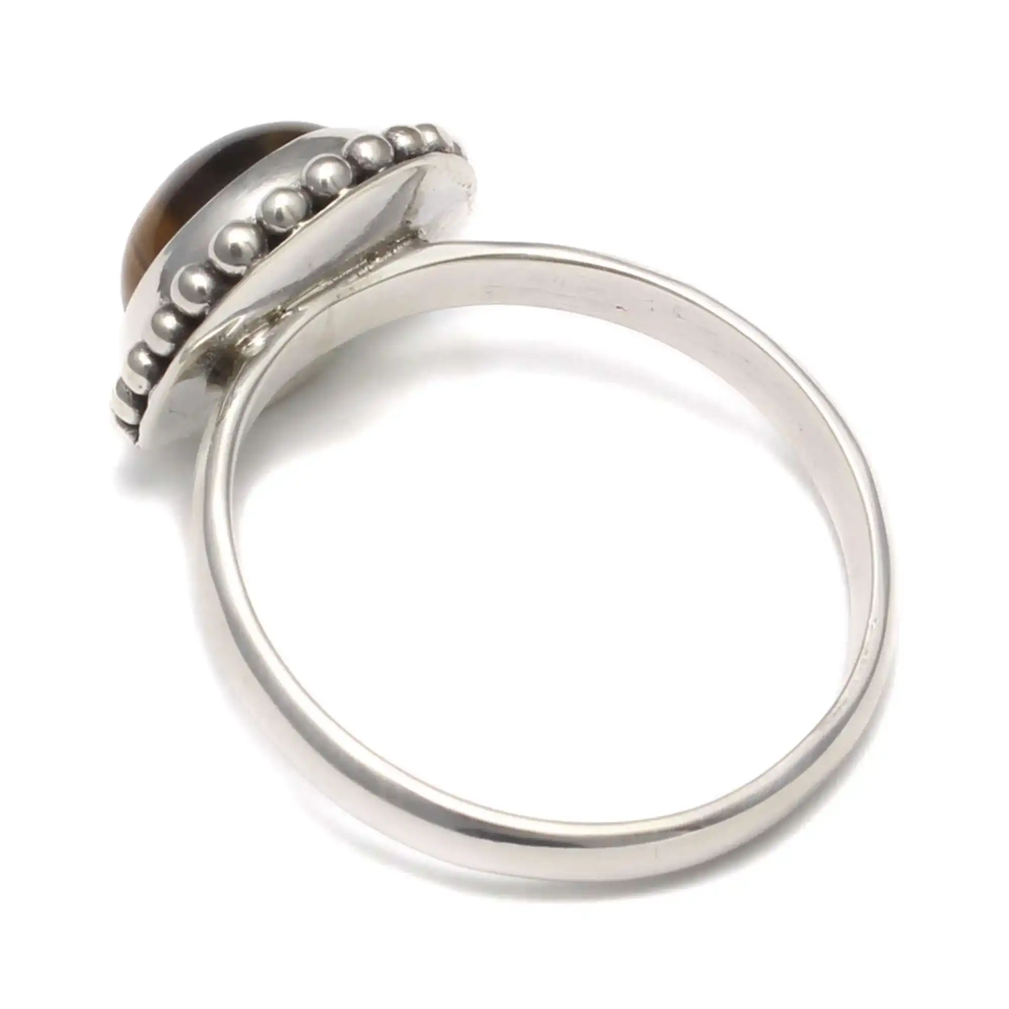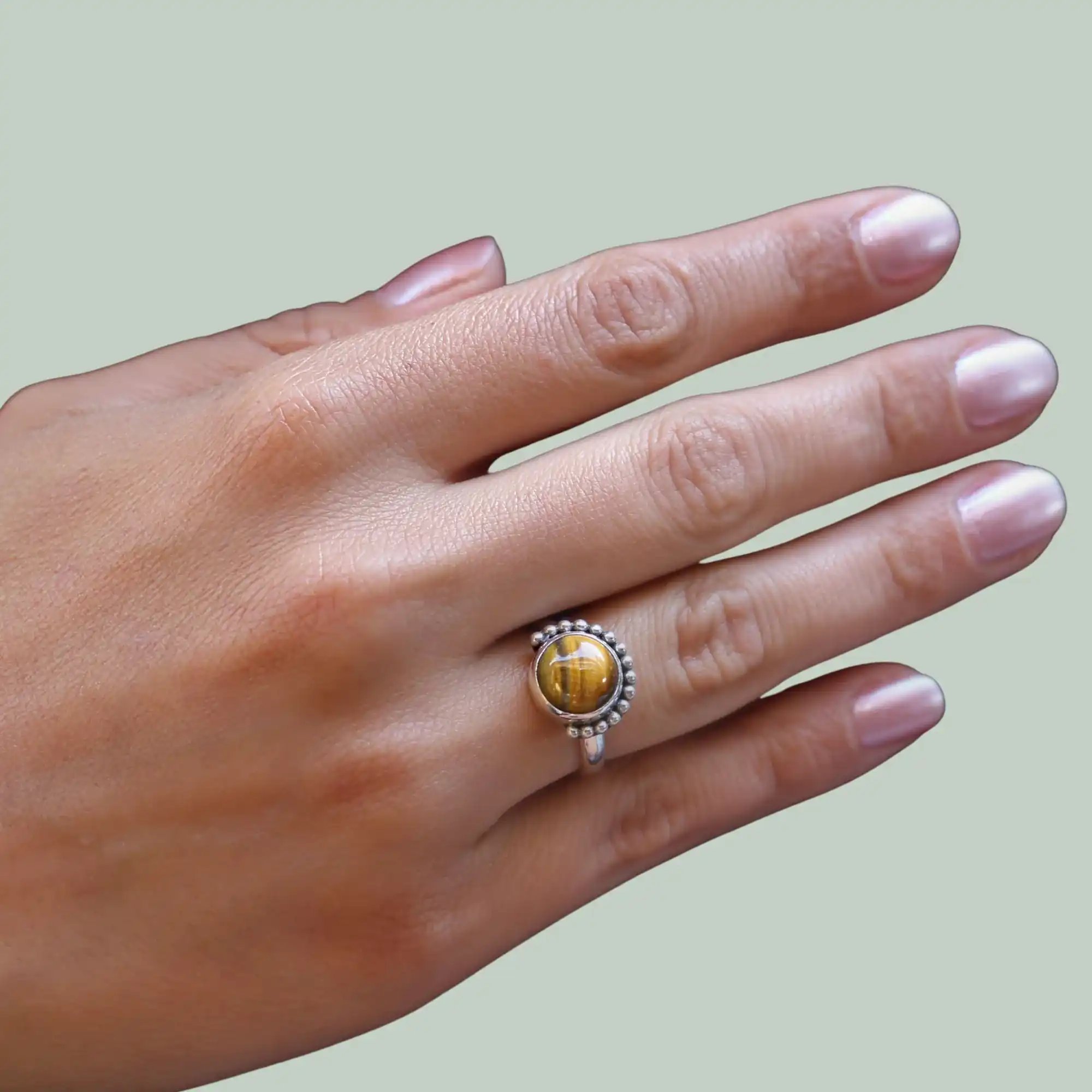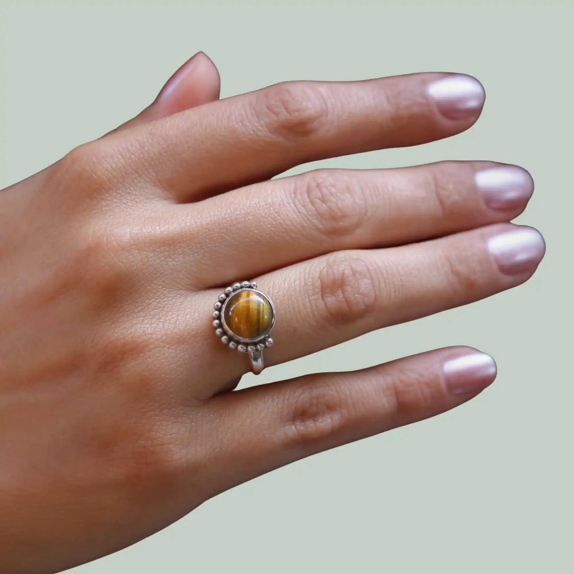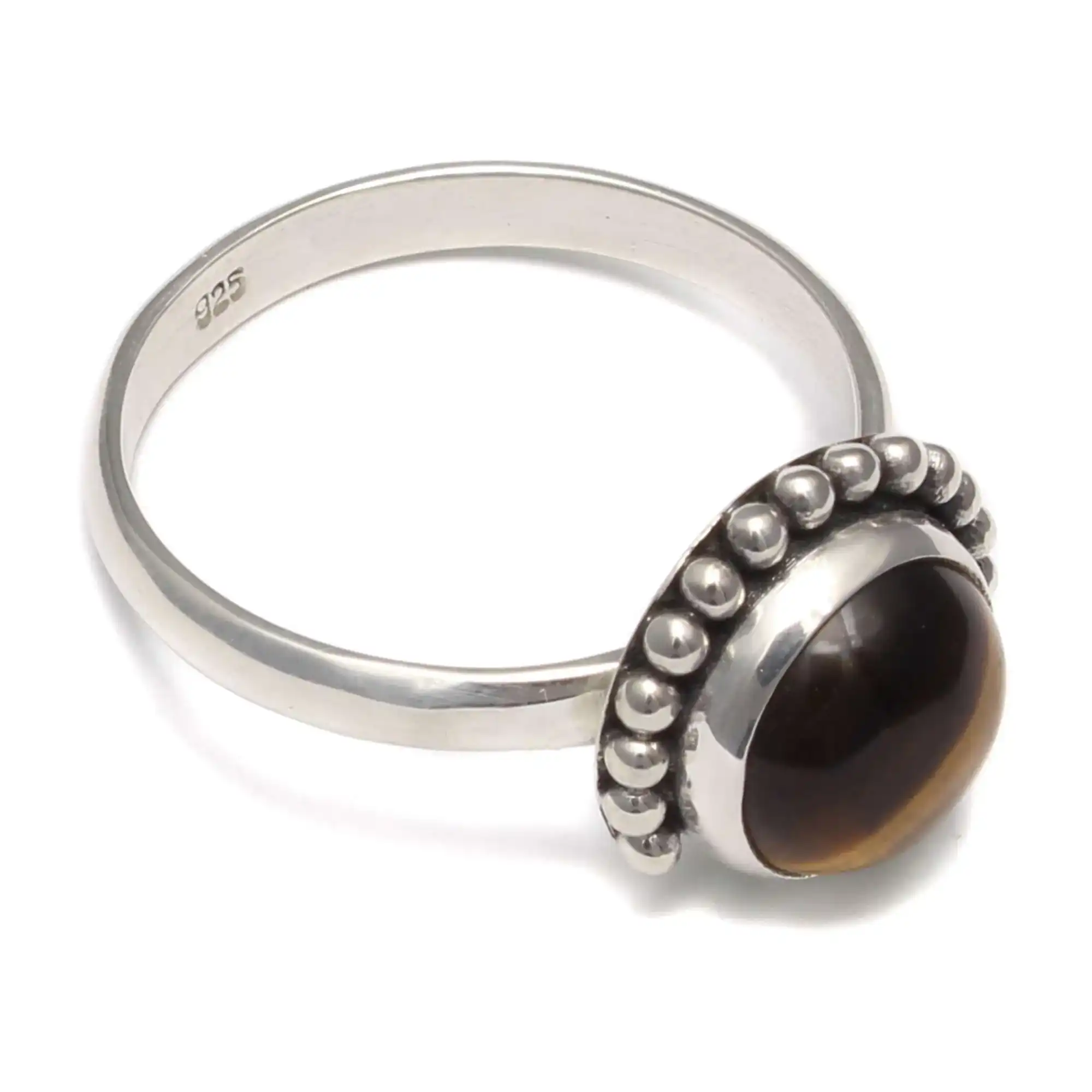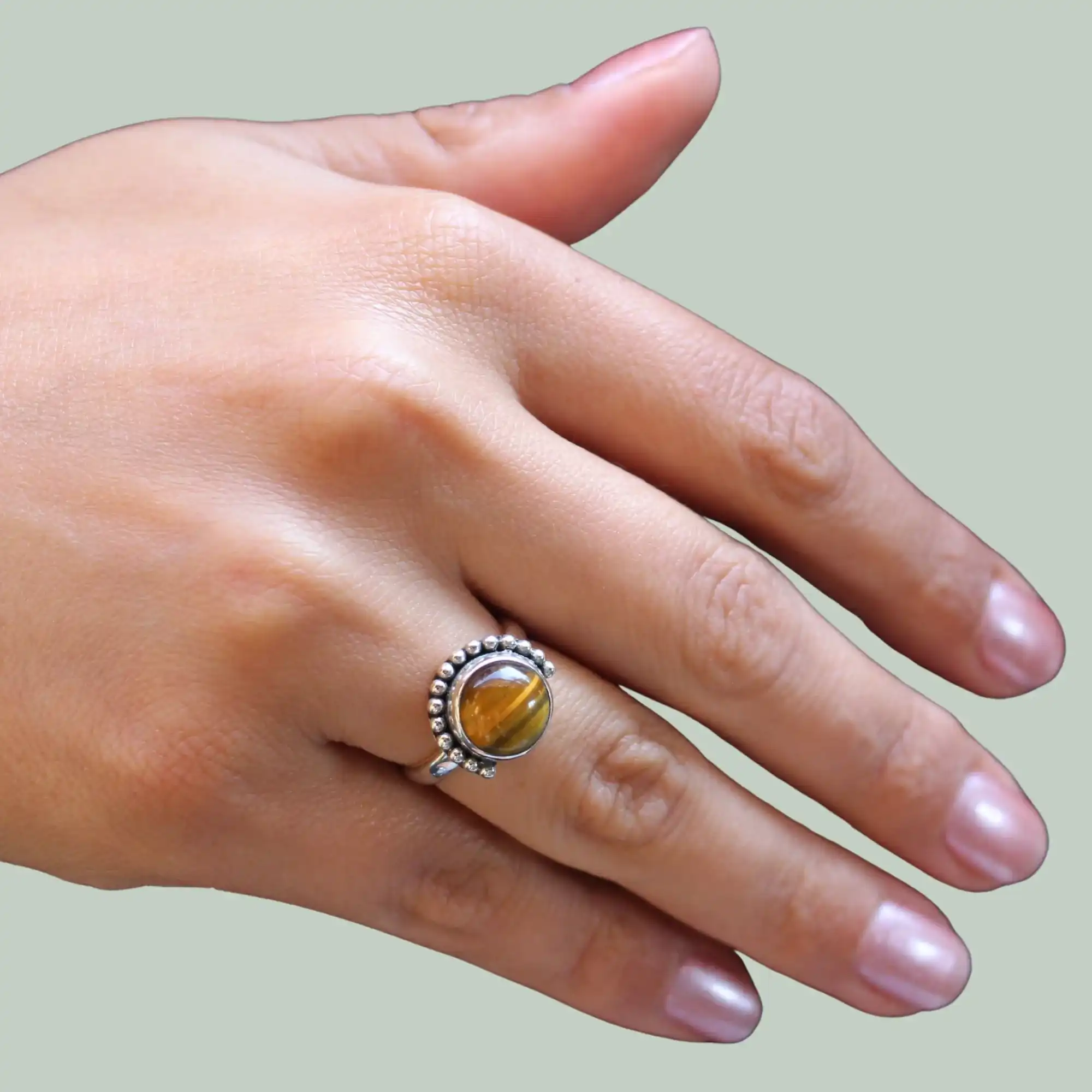 Der Ring wird nickelfrei gefertigt und ist dadurch ideal für empfindliche Haut geeignet. Die nachhaltige Verarbeitung sorgen für ein langlebiges Schmuckstück mit Charakter. Jeder Ring wirkt durch die individuelle Maserung des Tigerauges einzigartig.