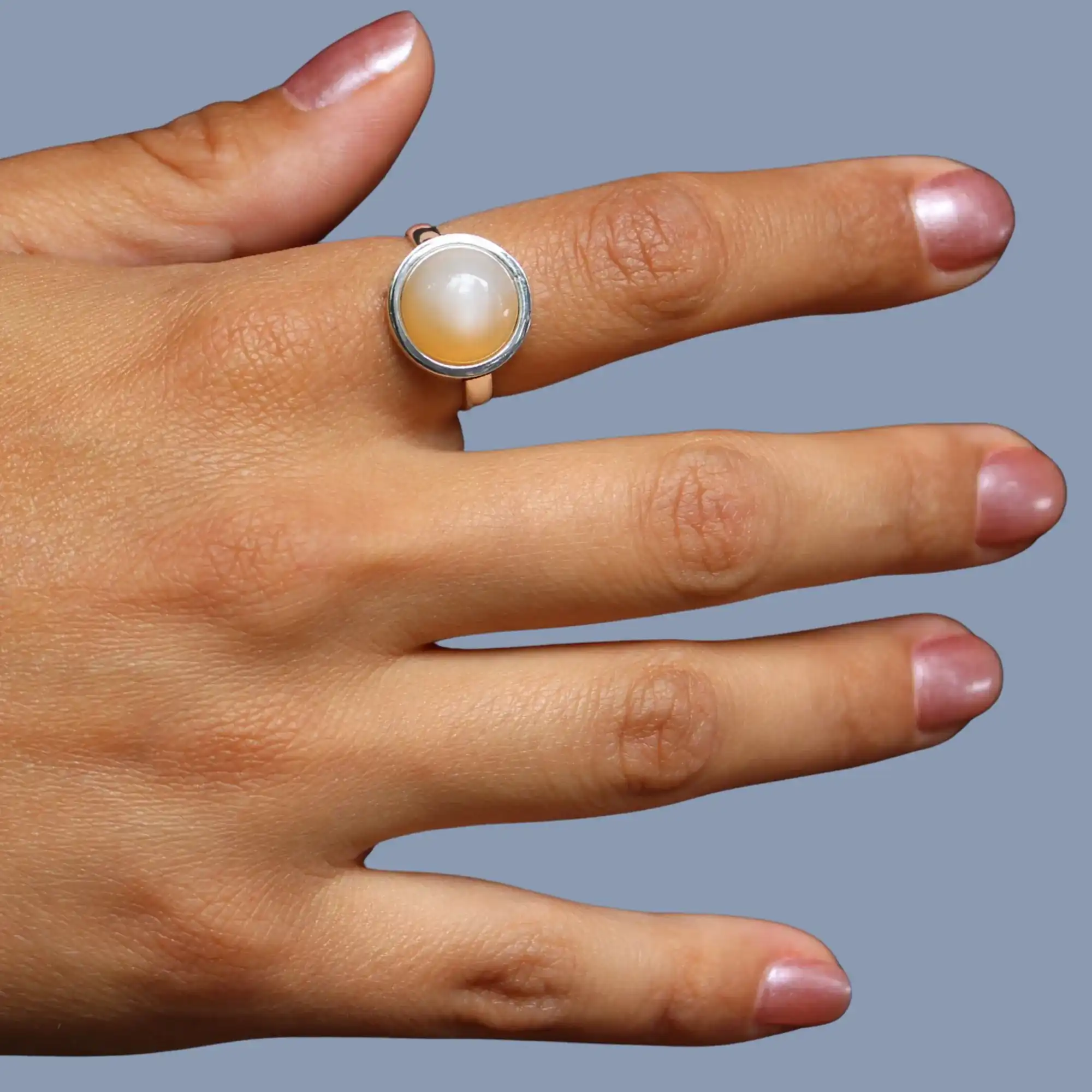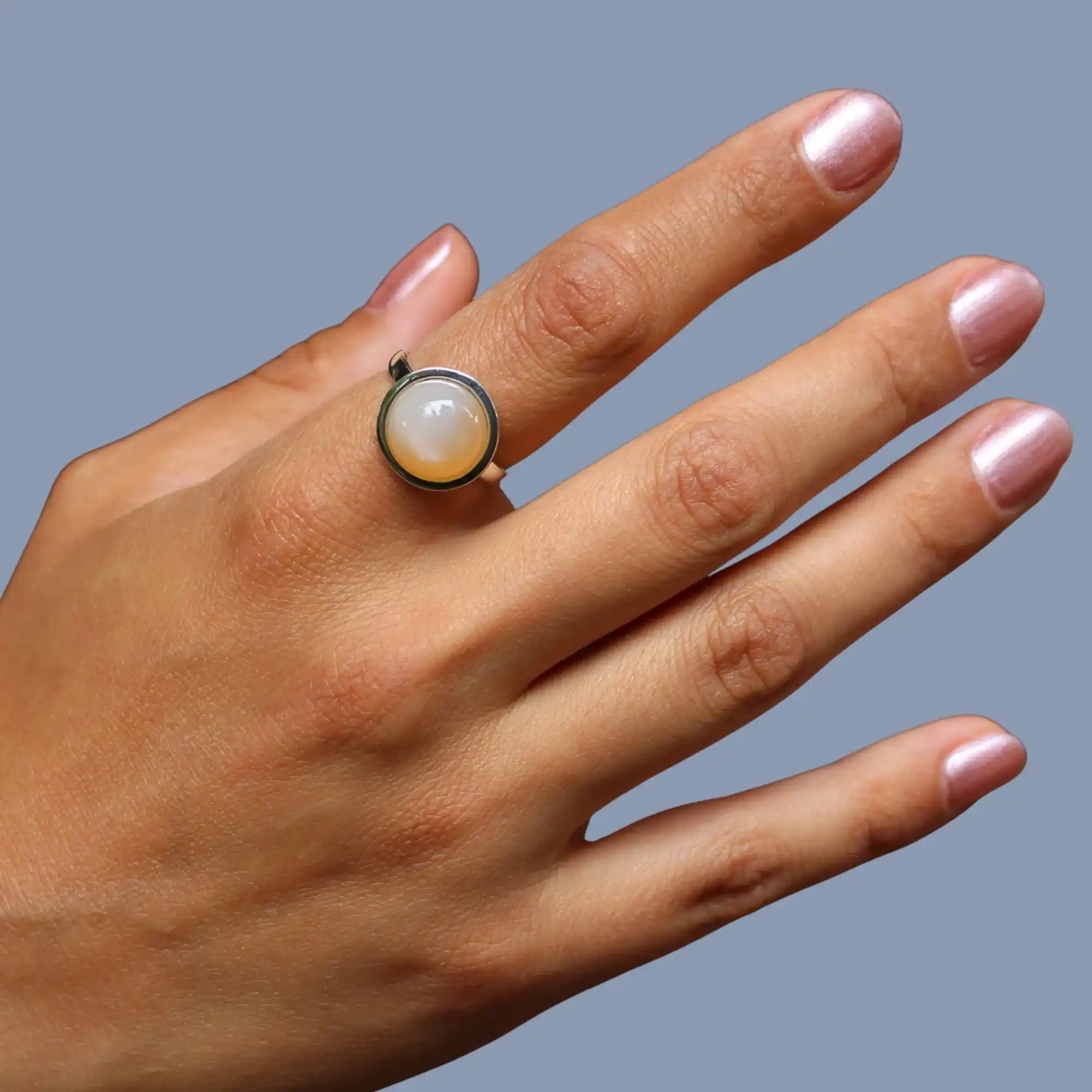 Der weiße Mondstein wird seit Jahrhunderten als Stein der Intuition und Harmonie geschätzt. In vielen Kulturen gilt er als Glücksstein für Liebe und Freundschaft. Funfact: Der weiße Mondstein gehört zur Feldspat-Gruppe und sein geheimnisvoller Glanz entsteht durch Lichtbrechung in feinen Kristallschichten – ein echtes Naturwunder direkt am Finger!Zeitlos, elegant und individuell