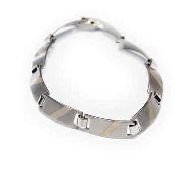 This is a combination of polished stainless steel and rubber strands that casually join together to form a bracelet.#